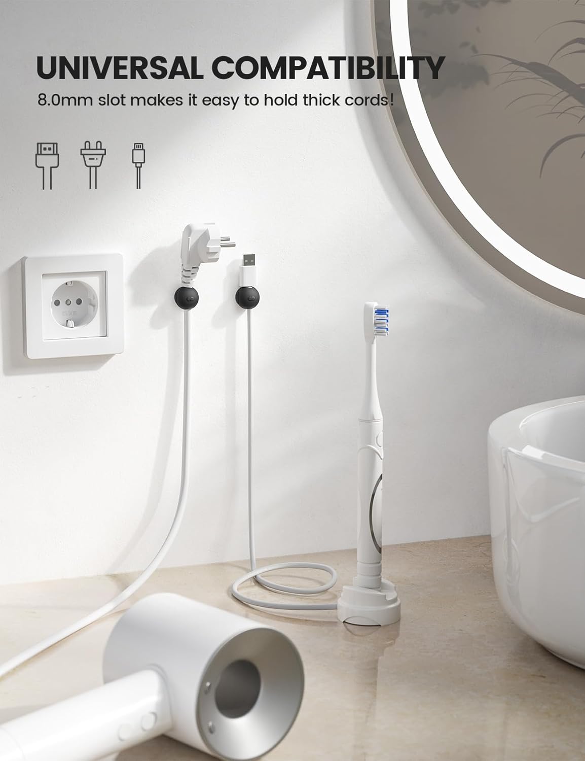 - 8mm Perfect Cable Slot Diameter: With a diamete of 0.32 inches (8.0mm), these cable management clips can hold most cables, such as phone charging cables, USB cords, HDMI thick cables, computer power cords, etc. Besides, the 0.32" slot diameter ensures the held cable can be pulled out smoothly for use.