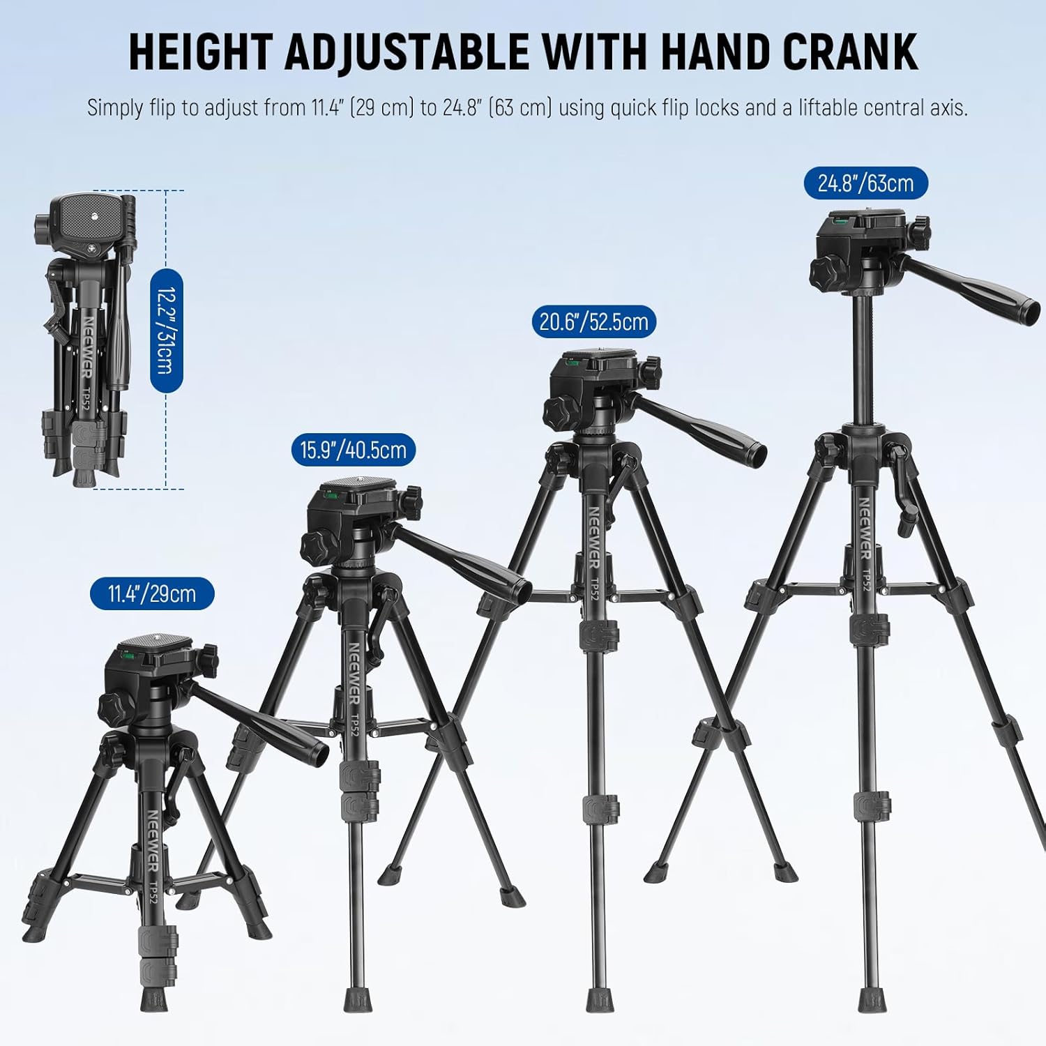 - 【Easy Height Adjustment】 The table tripod stand is crafted for effortless height adjustments from 11.4" (29 cm) to 24.8" (63 cm) using quick locks and a liftable central axis. For greater precision, the hand crank allows for fine tuning adjustments of up to 4.3" (11 cm). Also comes with a a counterweight hook on the center column for added stability