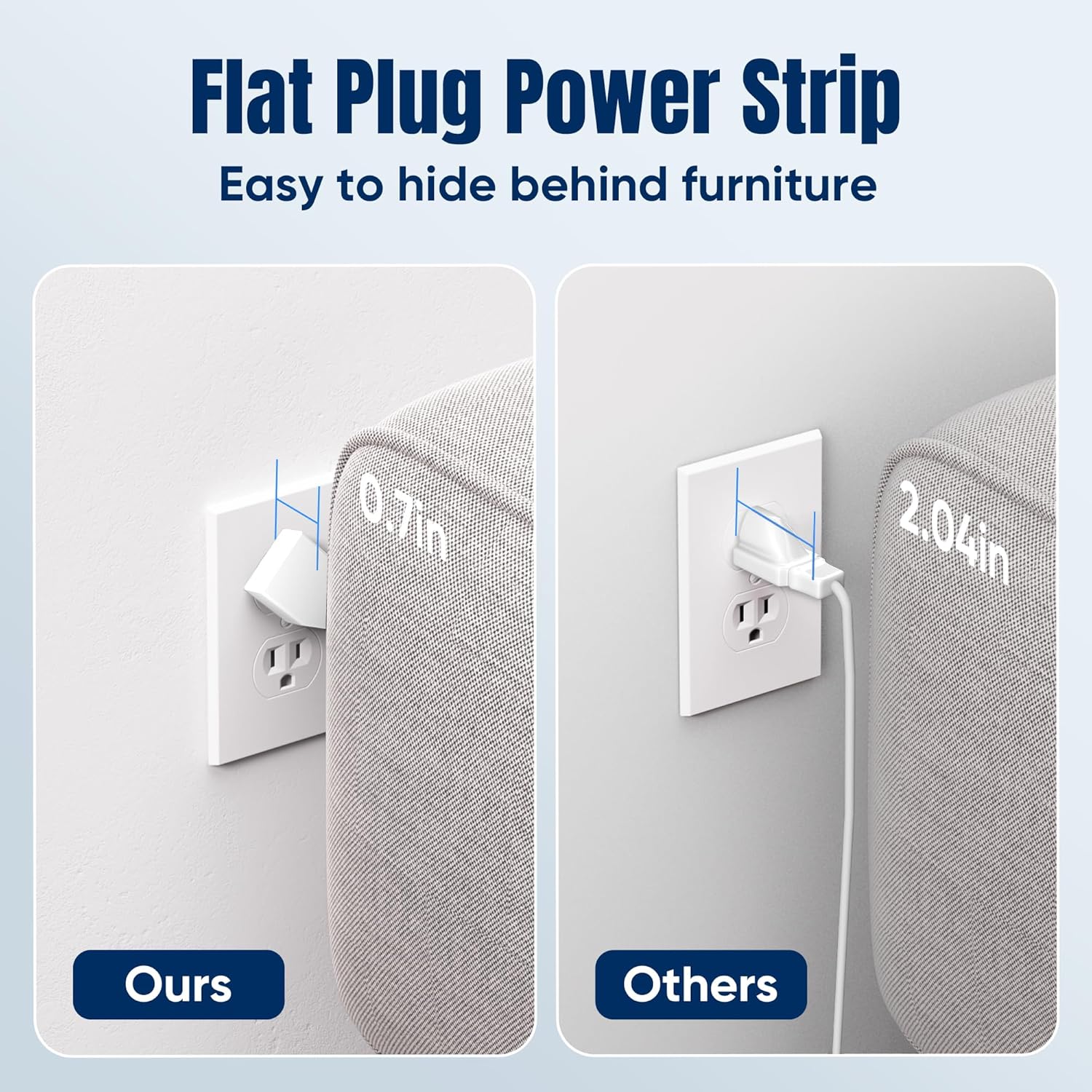 - 【Space Saving Design】- Experience the ultimate in space efficiency with JouleLoom 5FT surge protector's slim flat plug, measuring a mere 0.7 inches thick. Unlike traditional plugs, its unique 45-degree right-angle design ensures it won't obstruct neighboring outlets. Plus, with two multi-directional hanging holes, you can easily mount it horizontally or vertically on workstations, walls, counters, bedrooms, optimizing your space like never before