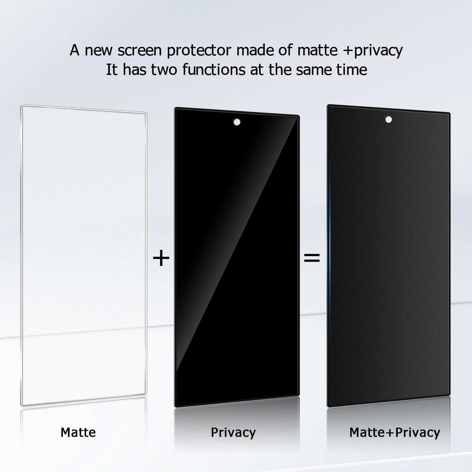 - ANTI-GLARE MATTEFINISH: S24 Ultra screen protector Privacy Matte finish reduces reflections and glare as well as reduces fingerprints and smudges on the screen. After installing this matte privacy screen protector, Reading in strong sunlight, outdoors or in light, is not dazzling and reducing your eye strain.