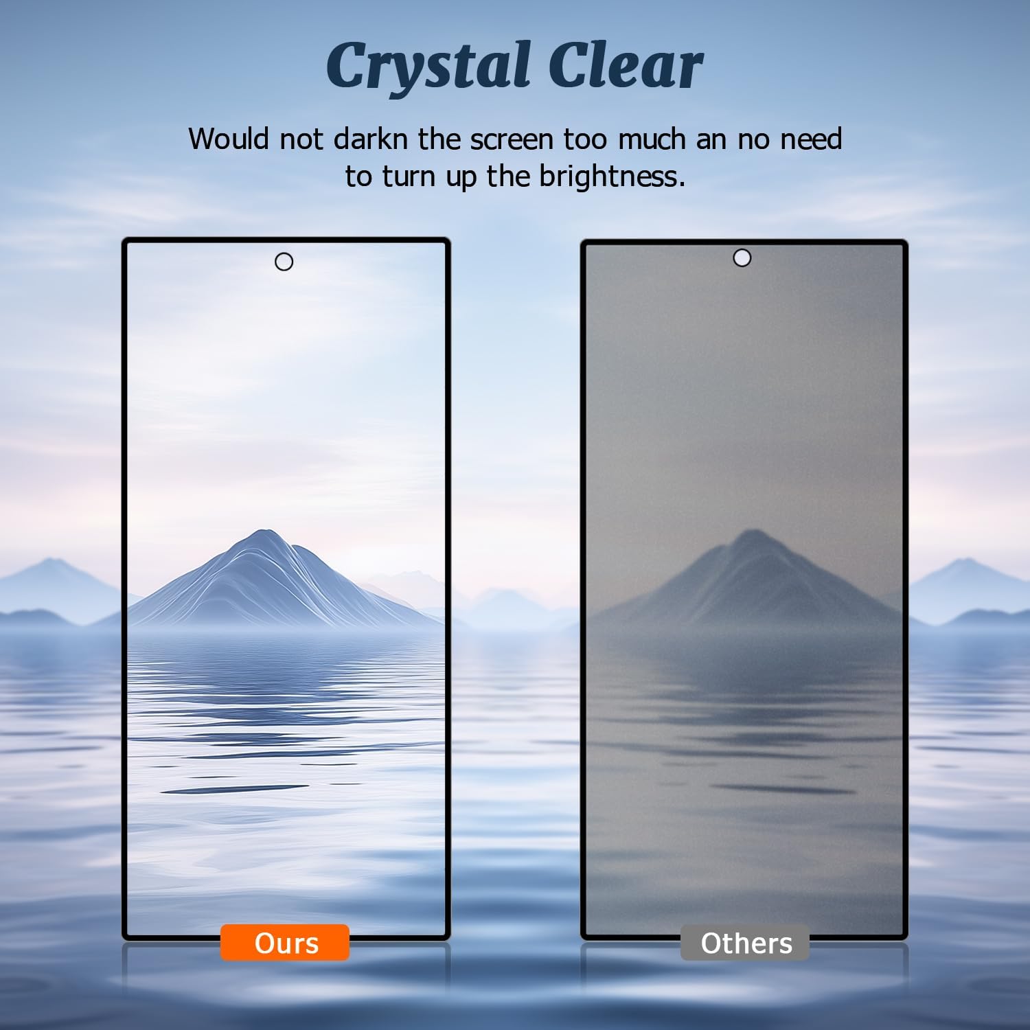 - PRIVACY SCREEN PROTECTOR:Perfect for keeping prying eyes from seeing at what youâre doing on your galaxy S24 Ultra screen protector.It will not only help prevent damage to your screen but will also protect your privacy from those around you. Great for people on the go, the dark screen makes it near impossible for someone to see your screen while looking over your shoulder. For anyone concerned about privacy who also visits busy public areas, itâs a simple solution to bring added protection to your device.