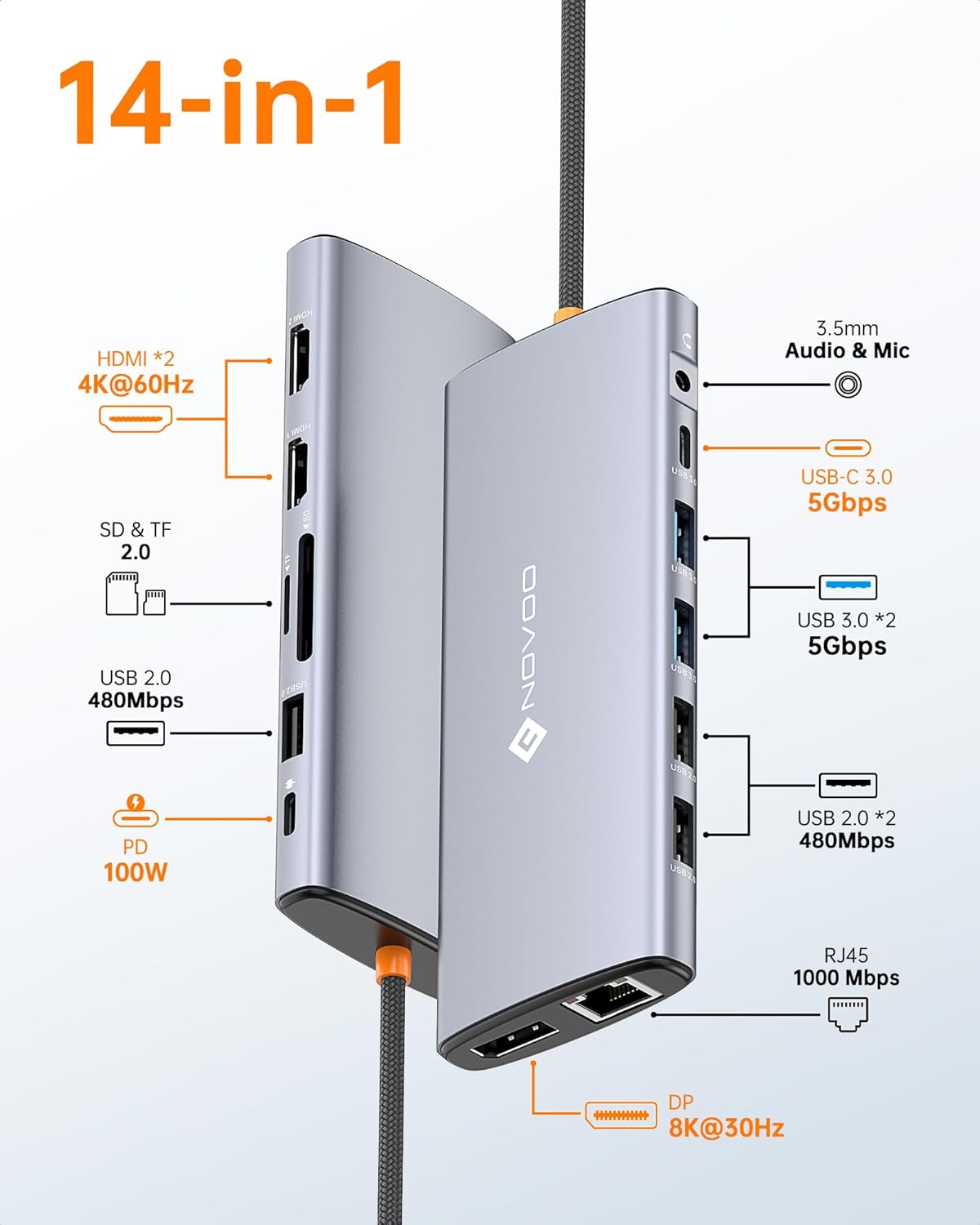 NOVOO USB C Docking Station Dual Monitor for Laptop, 14 in 1 Hub Adapter Thunderbolt 3 to Dual 4K60 HDMI+8K30 DP USB C/A Data 100W PD RJ45 SD/TF