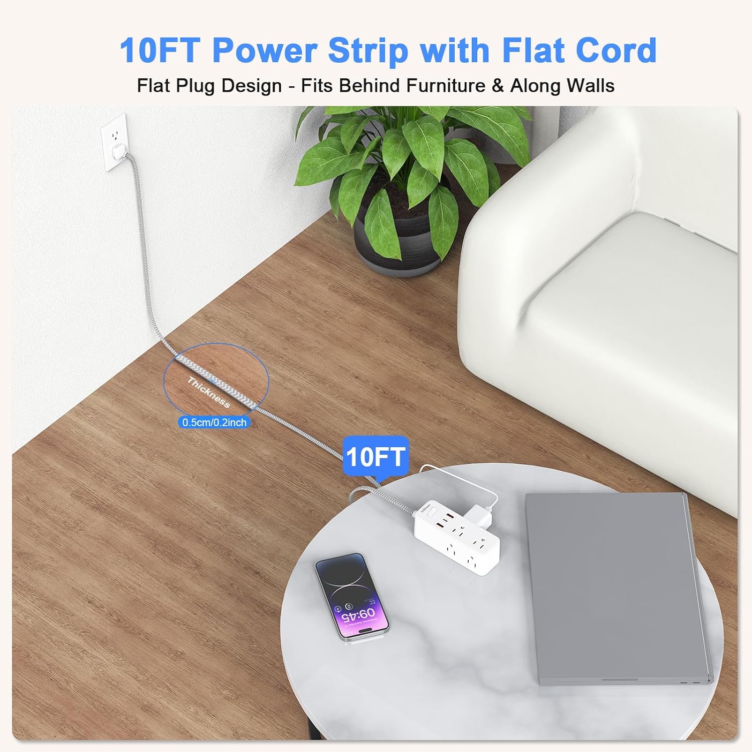 - 【Ultra Flat Plug Power Strip】With only 0.35 inch ultra thin plug and 45 degree right angle design, JcBlaon low profile flat wall plug is mush slimmer than traditional plugs, can close to the wall easily and hide in the back of furniture, bed or refrigerator, no waste for outlet and space. 10ft extension cord with only 3mm thicker which is made of pure copper, which has better current carrying capacity.