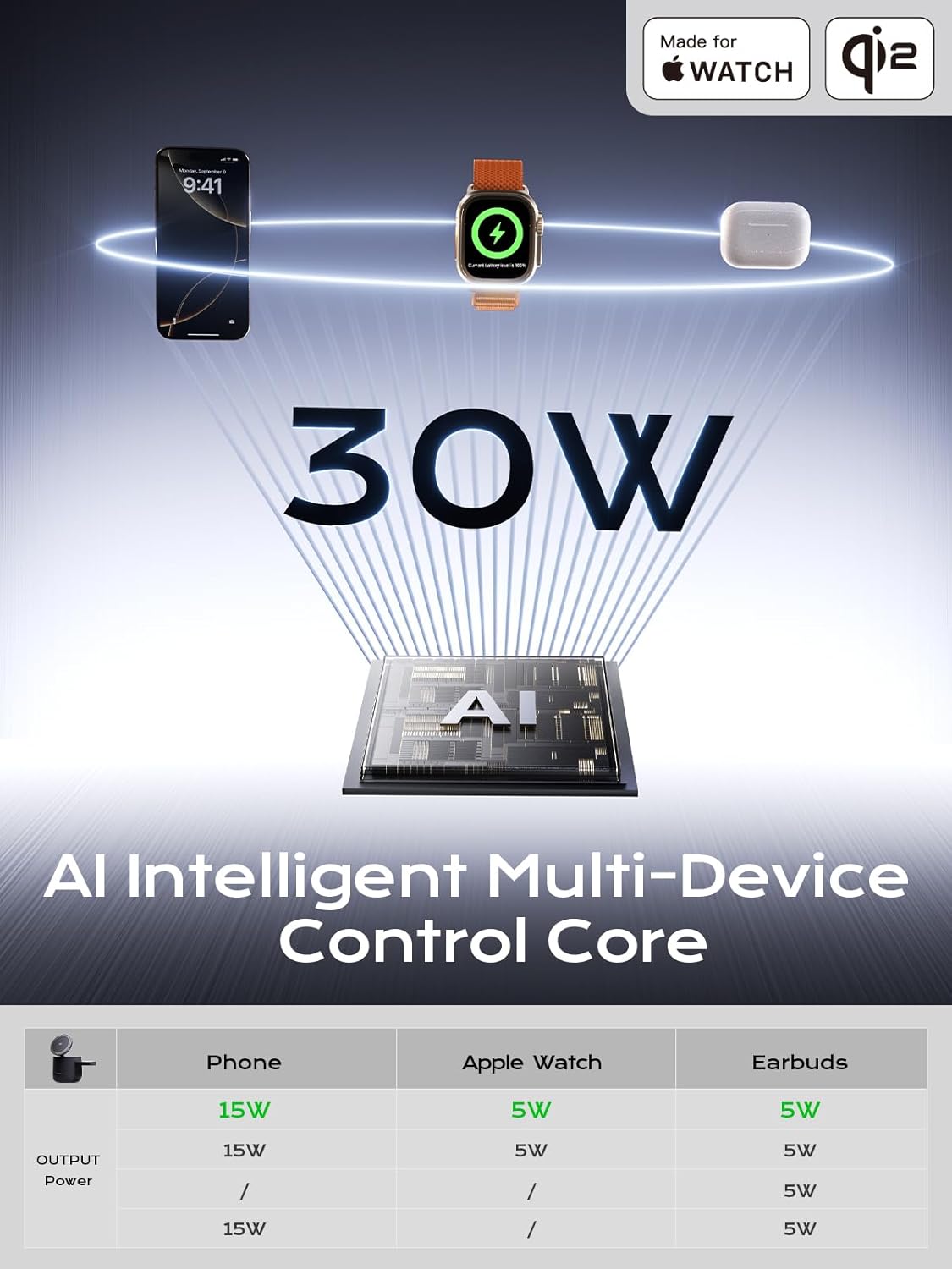 - đăAdvanced AI Intelligent Chips Control CoreăPowered by 5 exclusive TK-AI Chips, this qi2 3 in 1 magsafe charger ensure exceptional safety, efficiency and thermal management. The AI chips inside optimizes power delivery to provide comprehensive 360° protection against overheating, overvoltage, overcurrent, overcharge and short-circuit, safeguarding your device's longevity and potentially extending battery life.