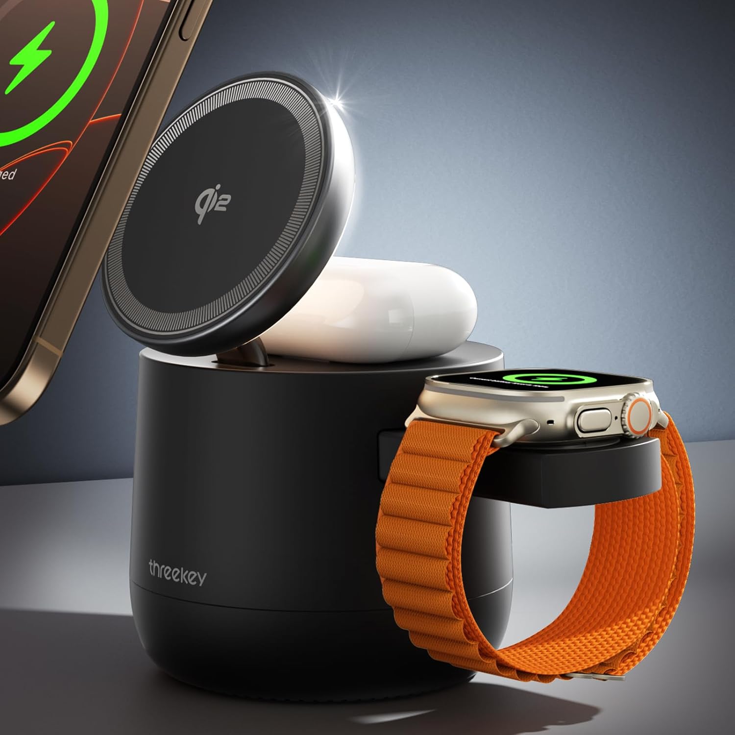 - đăStandBy Ready & Flexible Positioning Up to 70°ăStyle your iPhone as you'd like, as Threekey's iphone apple watch and airpods charging station supports StandBy Mode. Your phone will remain in the perfect position as you turn it into a bedside clock, photo frame, widget display, and more. Effortlessly toggle between landscape and portrait orientations for optimal viewing comfort, while maintaining a reliable charge to your device.
