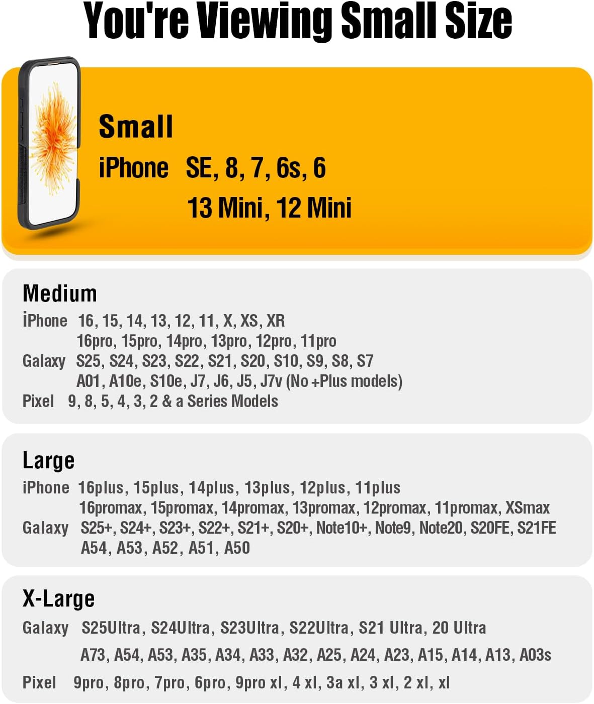 - Small size holster designed for iPhone SE, 8, 7, 6s, 6 phone models with protective cases on.