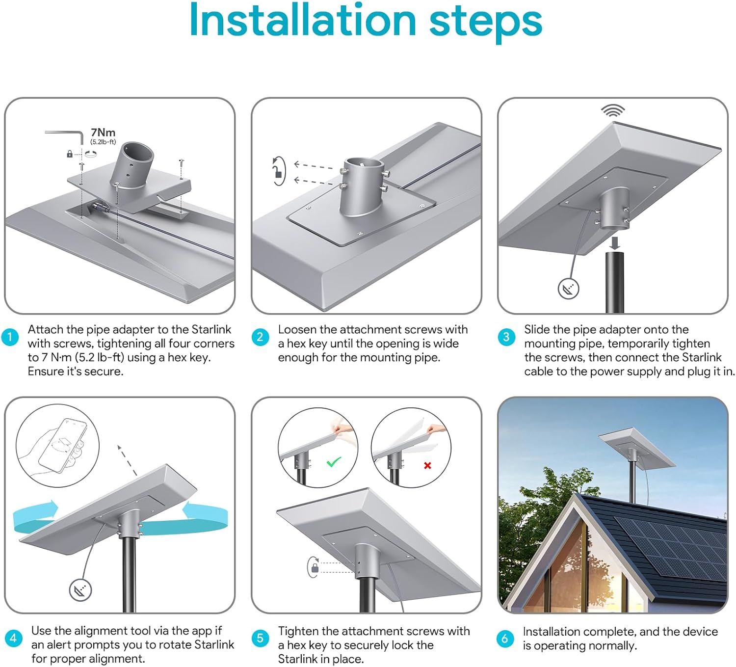 - *Easy Setup: Hassle-free installation with included hardware. Just slide the starlink performance gen3 pipe adapter onto the pole, tighten the screws, and place your Starlink v3 hp device. (Note: performance gen 3 Starlink pole required not included).