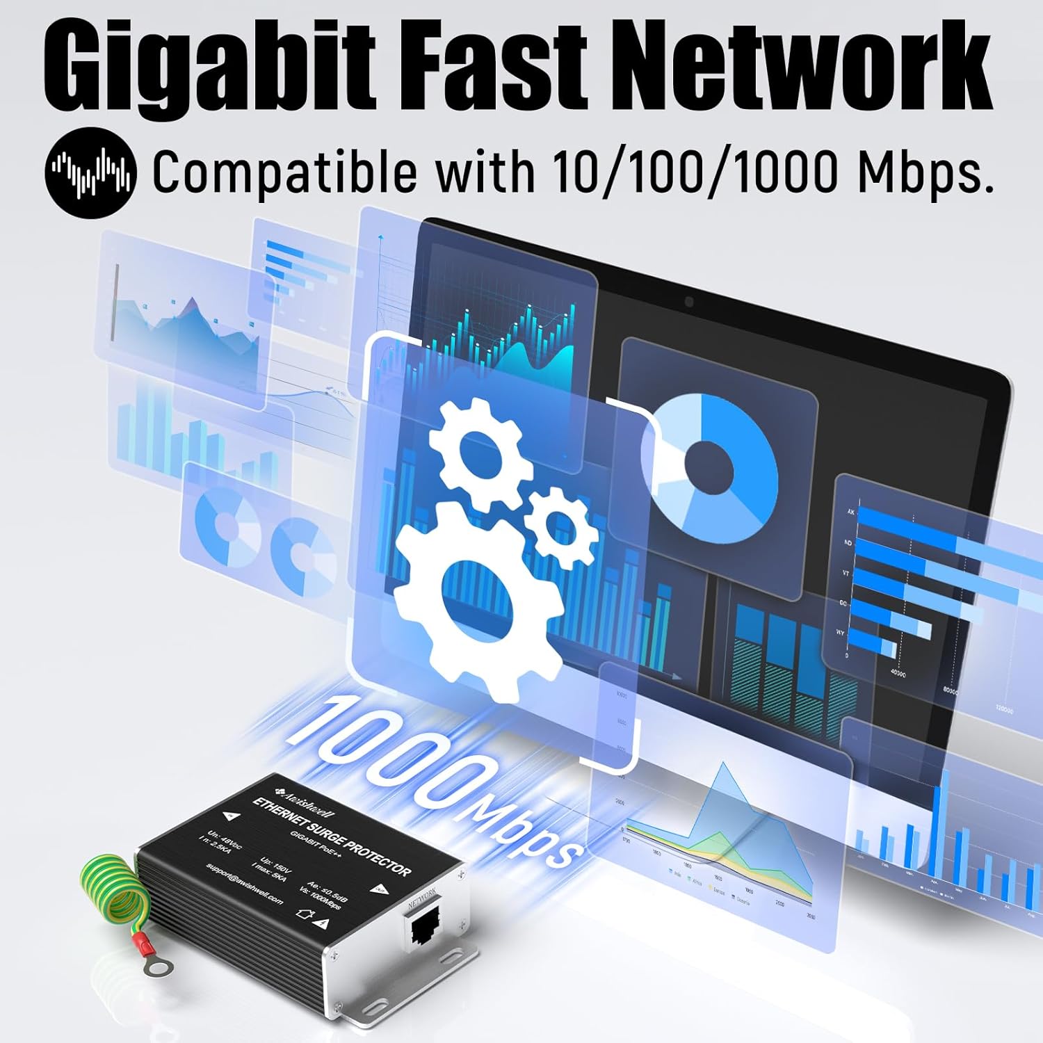 - 【Surge Protection】:Ethernet surge protector is designed to protect equipment against transients from lightning, ESD, and ground surges. Awishwell surge protector supports speeds up to 1 Gigabit -1000 Mbps, and provides PoE++ 802.3af/at/bt compatibility with 3KV surge protection, without affecting network performance. Peak surge current protection up to standard 5KA 8/20μs