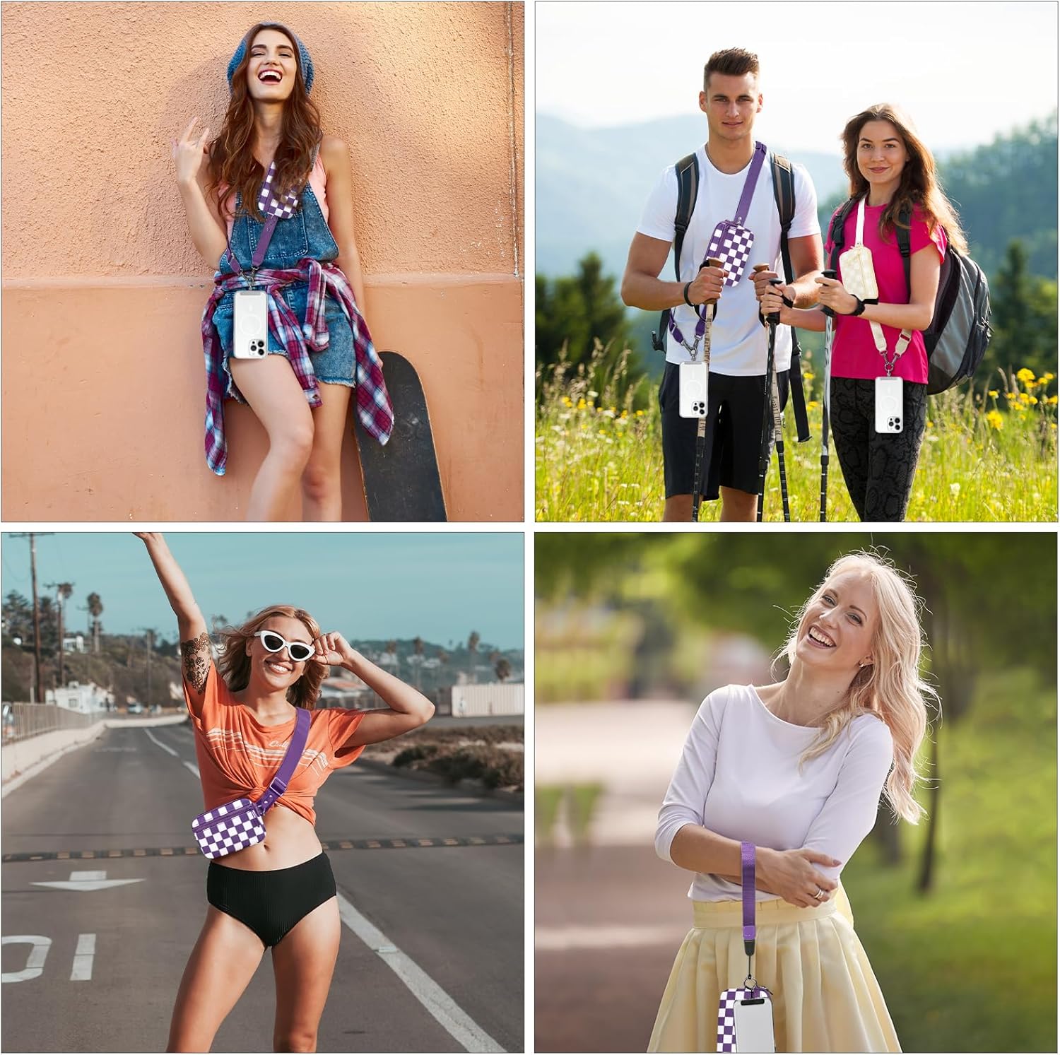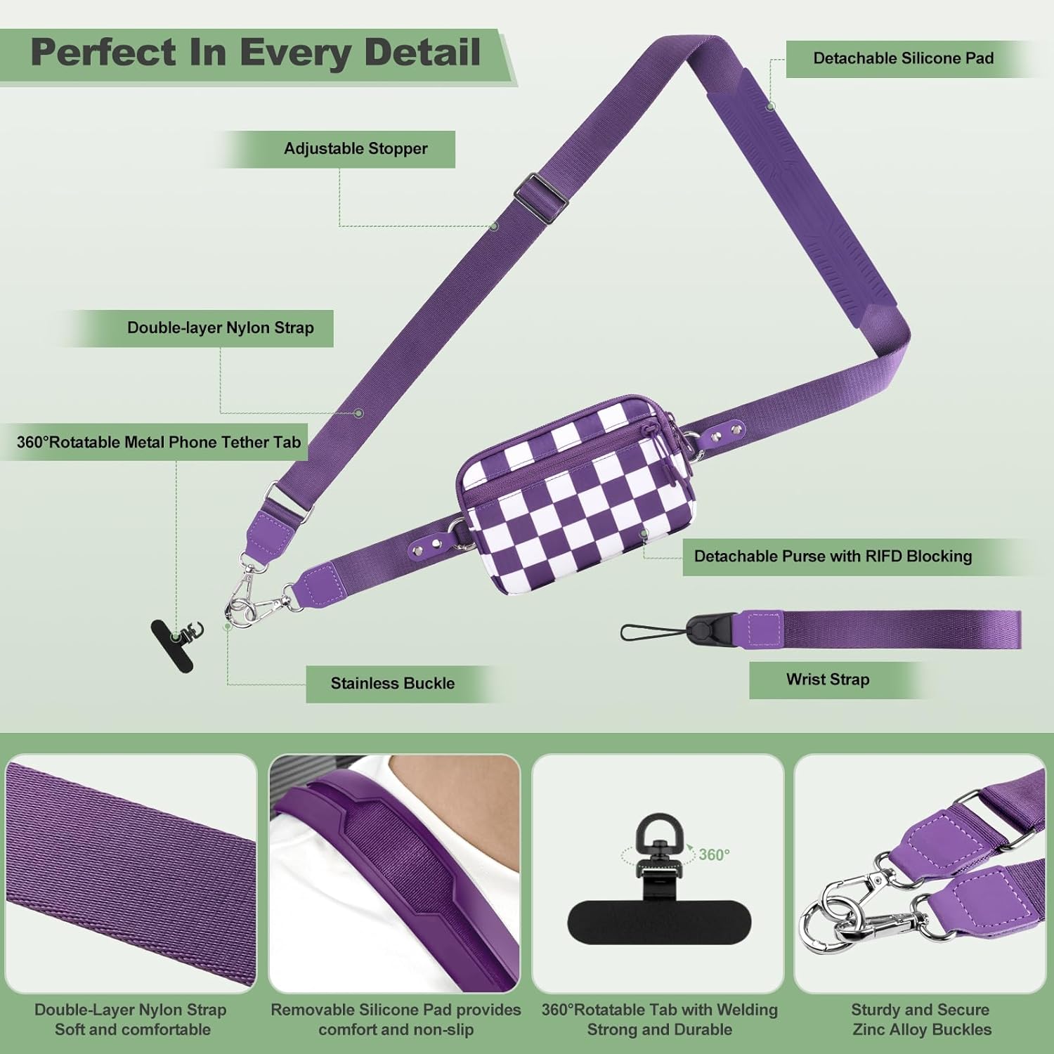 Clip and Go Strap for Phone with Wallet Crossbody, Adjustable Phone Lanyard with Detachable RFID Wristlet Wallet, Phone Strap with Phone Tabs for All Phones, Purple Checkered (M)