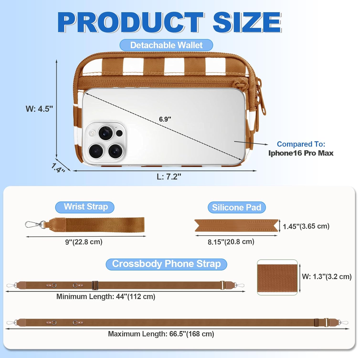 Clip and Go Strap for Phone with Wallet Crossbody, Adjustable Phone Lanyard with Detachable RFID Wristlet Wallet, Phone Strap with Phone Tabs for All Phones, Bronze Checkered (L)