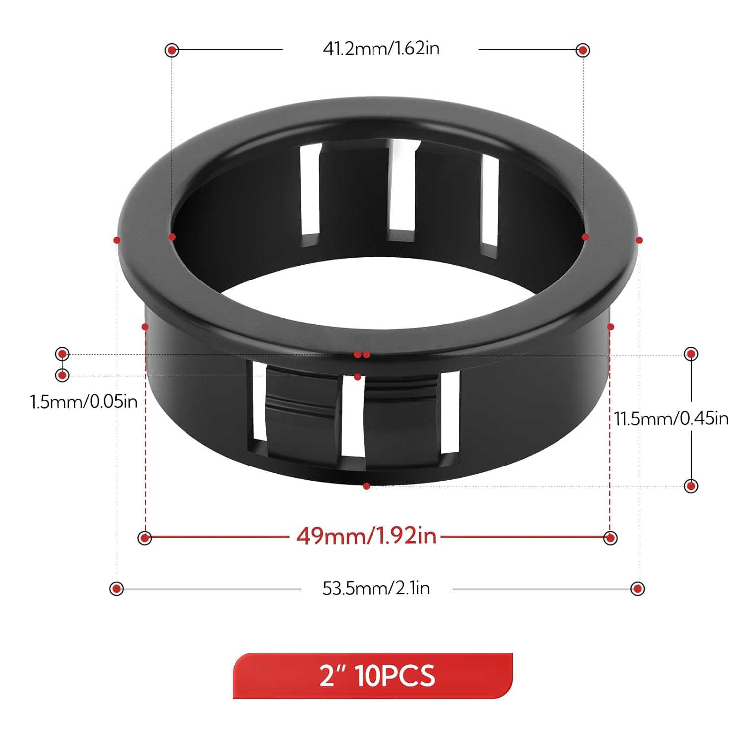 - Dimensions: Model SB-50 (10-piece pack), Inner Diameter: 41mm/1.6 inches; Outer Diameter: 54mm/2.1 inches; Height: 11mm/0.45 inches; Mounting Hole Diameter: 50mm/1.9 inches