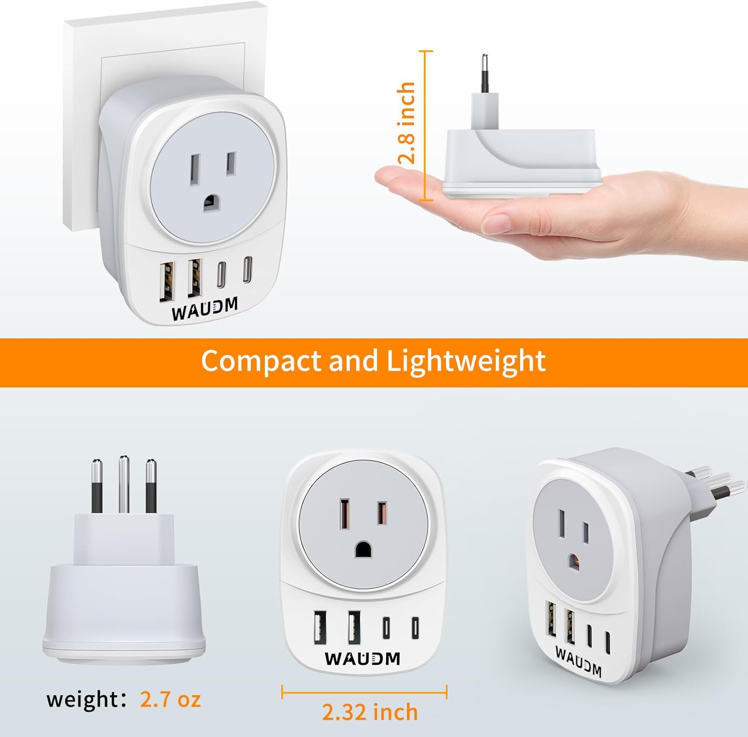 - ULTRA LIGHTWEIGHT COMPACT DESIGN: This Italian plug adapter is very mini and perfect for travel use, measuring only 2.8 x 2.2 x 2.6 inches and weighing 3.0 ounces, with LED blue indicator, surge, overvoltage, overcurrent, and short-circuit protection as well as anti-static protection.