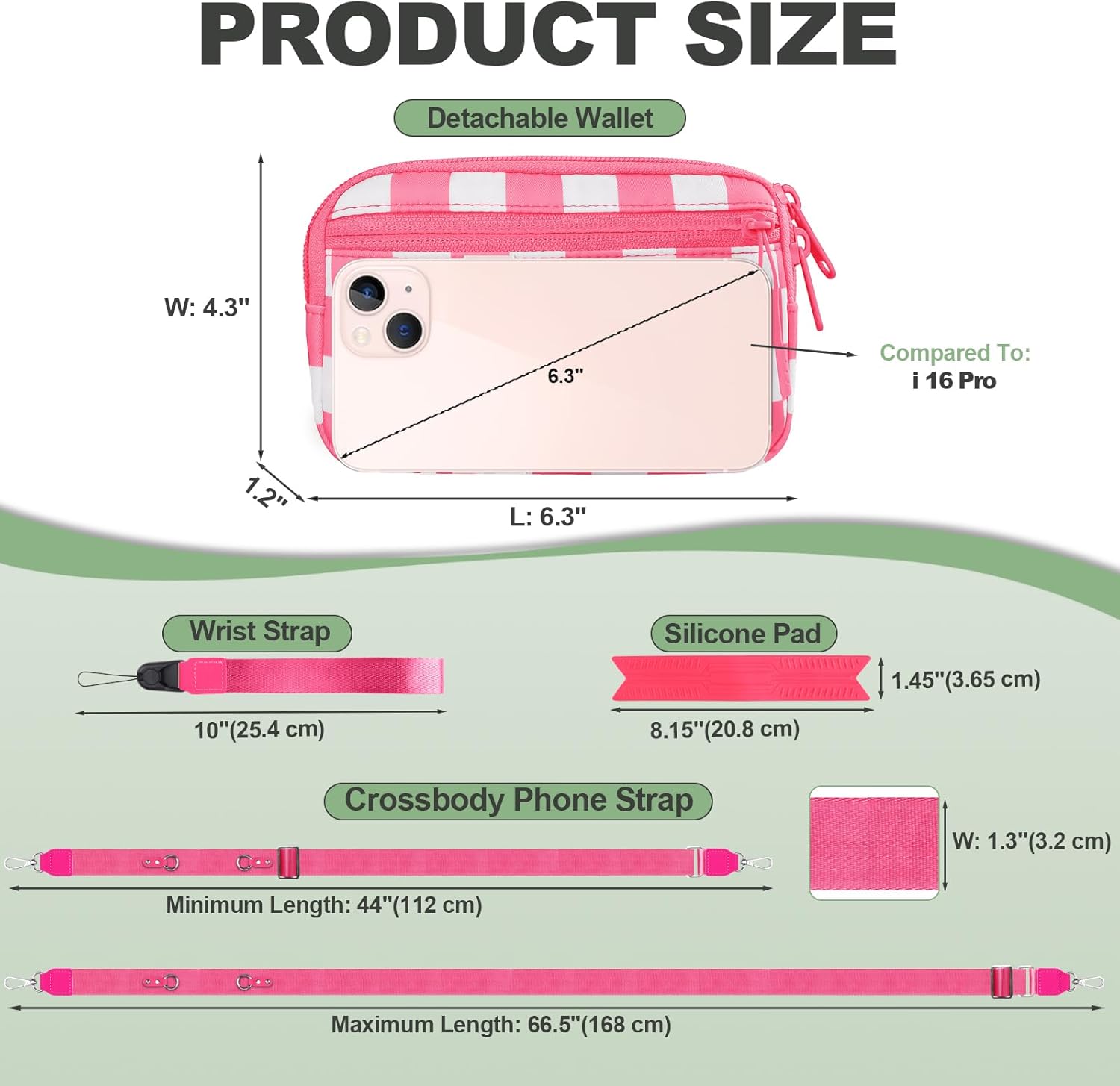 Clip and Go Strap for Phone with Wallet Crossbody, Adjustable Phone Lanyard with Detachable RFID Wristlet Wallet, Phone Strap with Phone Tabs for All Phones, Pink Checkered (M)