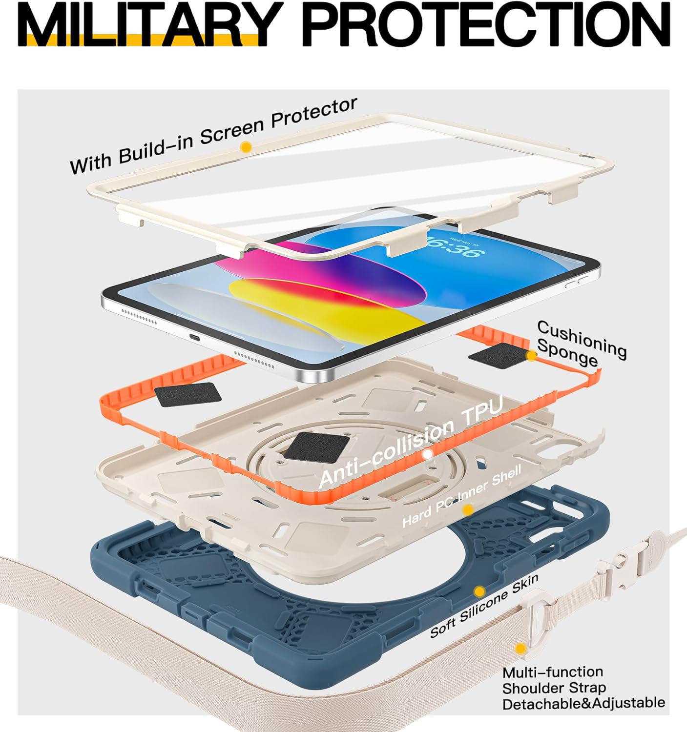 - [360°Rotating Handle/Stand & Shoulder Strap]:This ipad 11/10.9 inch case have a 360° rotation system that includes a kickstand and a hand strap, by rotating it, you can hold your ipad at any angle, by utilizing the swivel and the stand, you can support your ipad at multiple angles.The adjustable shoulder strap allows you to carry or hang your iPad at any time, so that you can provide more convenience in outdoor sports, traveling.
