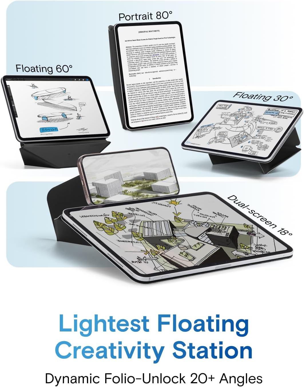 - Dynamic Angles, Move with Flow - The Dynamic Folio with 20+ adjustable angles for iPad offers fluid angle adjustments that flow with your every need. Effortlessly shifting from work to creativity, it combines minimalist design with versatile functionality, enhancing your dynamic lifestyle.
