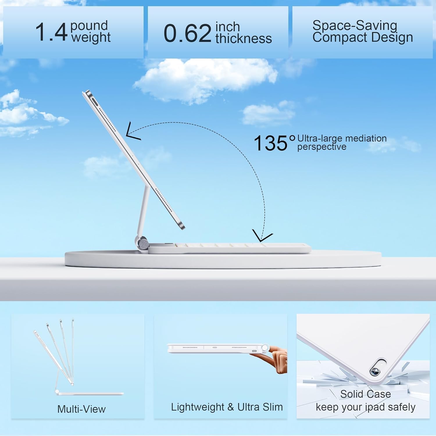 - Floating Cantilever Stand & Multi-View Flexibility: The magic-style floating cantilever stand and strong magnetic attraction hold iPad firmly and stably in place like a laptop, the floating cantilever design allows you to easily adjust to your favorite viewing angle for typing or browsing.