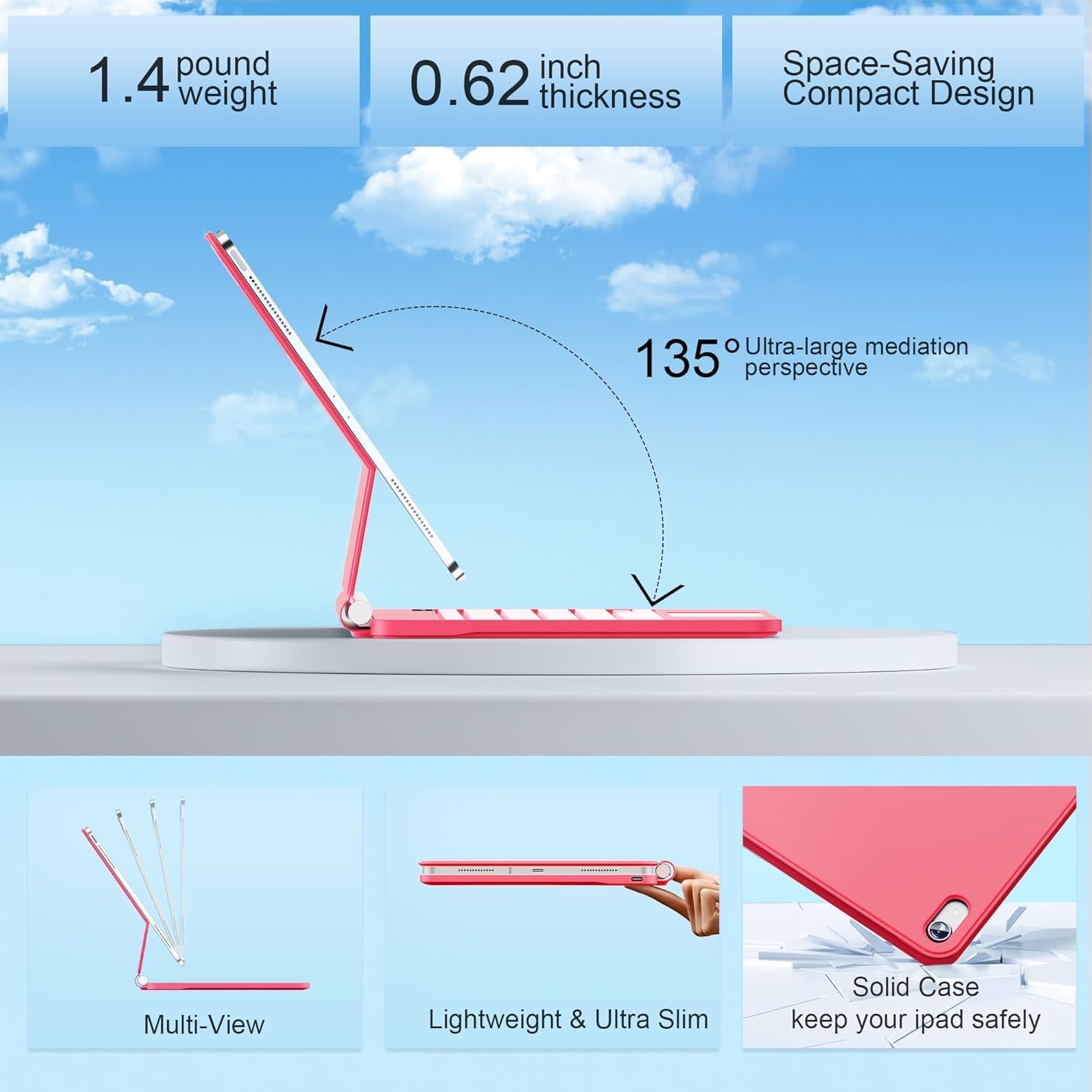 - Floating Cantilever Stand & Multi-View Flexibility: The magic-style floating cantilever stand and strong magnetic attraction hold iPad firmly and stably in place like a laptop, the floating cantilever design allows you to easily adjust to your favorite viewing angle for typing or browsing.