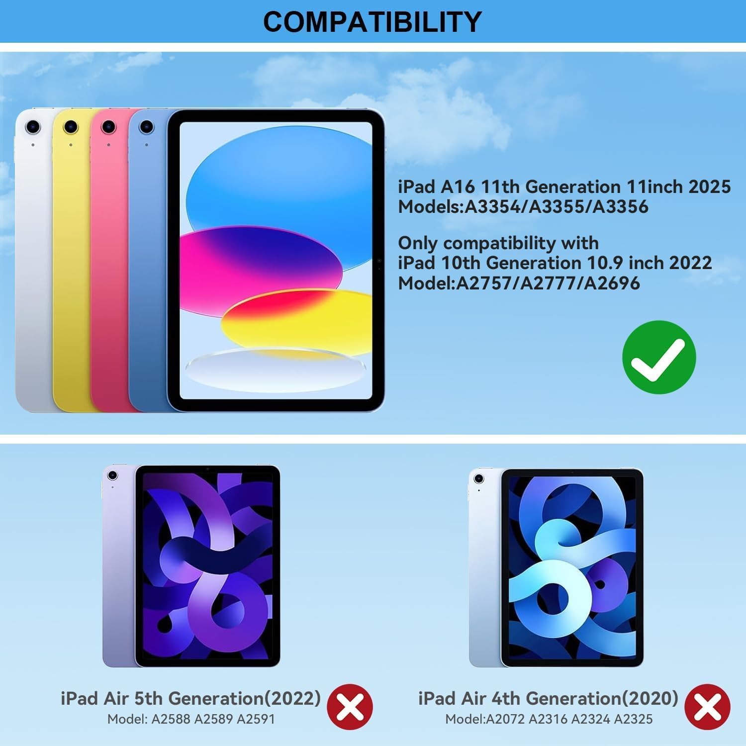- Case Compatibility: This keyboard case is only compatible with iPad 10.9 inch 10th Generation (Models A2696, A2757, A2777 ) and iPad A16 11th 2025 (Model Number: A3355/A3356)