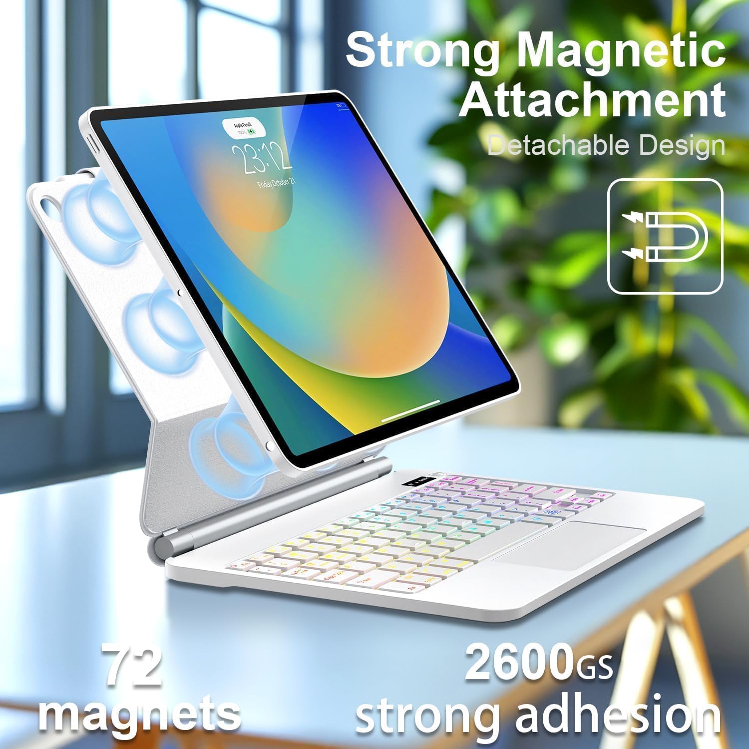 - Floating Cantilever Stand & Multi-View Flexibility: The magic-style floating cantilever stand and strong magnetic attraction hold iPad firmly and stably in place like a laptop, the floating cantilever design allows you to easily adjust to your favorite viewing angle for typing or browsing.